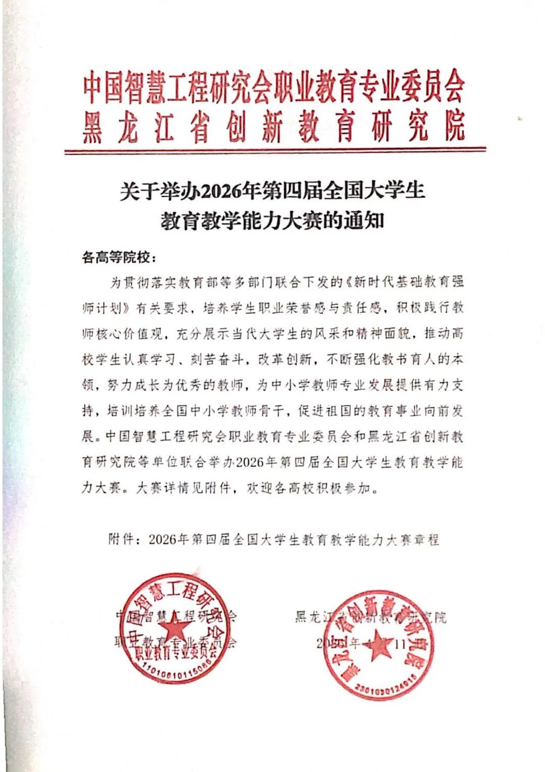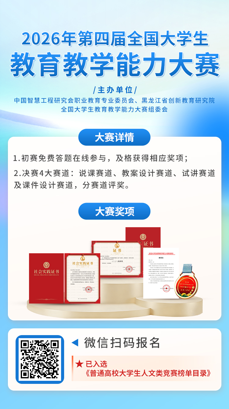 全国大学生教育教学能力大赛成功入选《2026年普通高校大学生人文类竞赛指数目录》赛事,并受到了各高校老师和学生们的高度评价,中国智慧工程研究会职业教育专业委员会和黑龙江省创新教育研究院等单位决定联合举办2026年第四届全国大学生教育教学能力大赛。