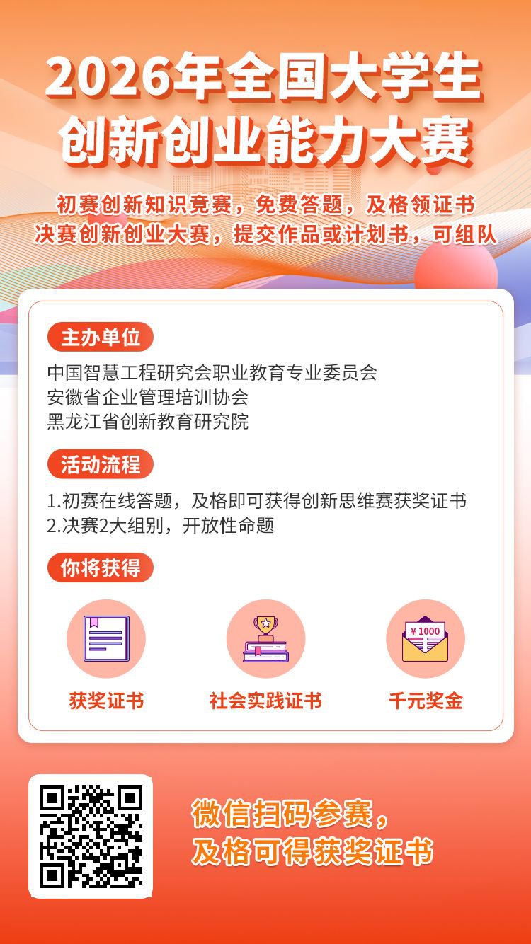 为深入贯彻落实党的二十届四中全会精神和“十五五”规划部署,响应“建设现代化产业体系”“推动科技创新和产业创新深度融合”等战略方向,引导广大青年学子扎根中国大地,以创新思维服务国家需求,将个人理想融入高质量发展大局。让更多青年在创新创业实践中增长智慧才干,成为发展新质生产力的生力军,为扎实推进全体人民共同富裕贡献青春力量。往届大赛获得了各高校师生的广泛认可与高度评价。中国智慧工程研究会职业教育专业委员会、安徽省企业管理培训协会、黑龙江省创新教育研究院等单位决定联合举办2026年第五届全国大学生创新创业能力大赛。