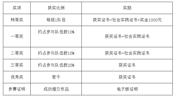 优秀协办单位奖:视组织学生人数情况而定,组织100名学生及以上的院校颁发优秀协办单位证书,排名前5名颁发优秀协办单位牌匾。