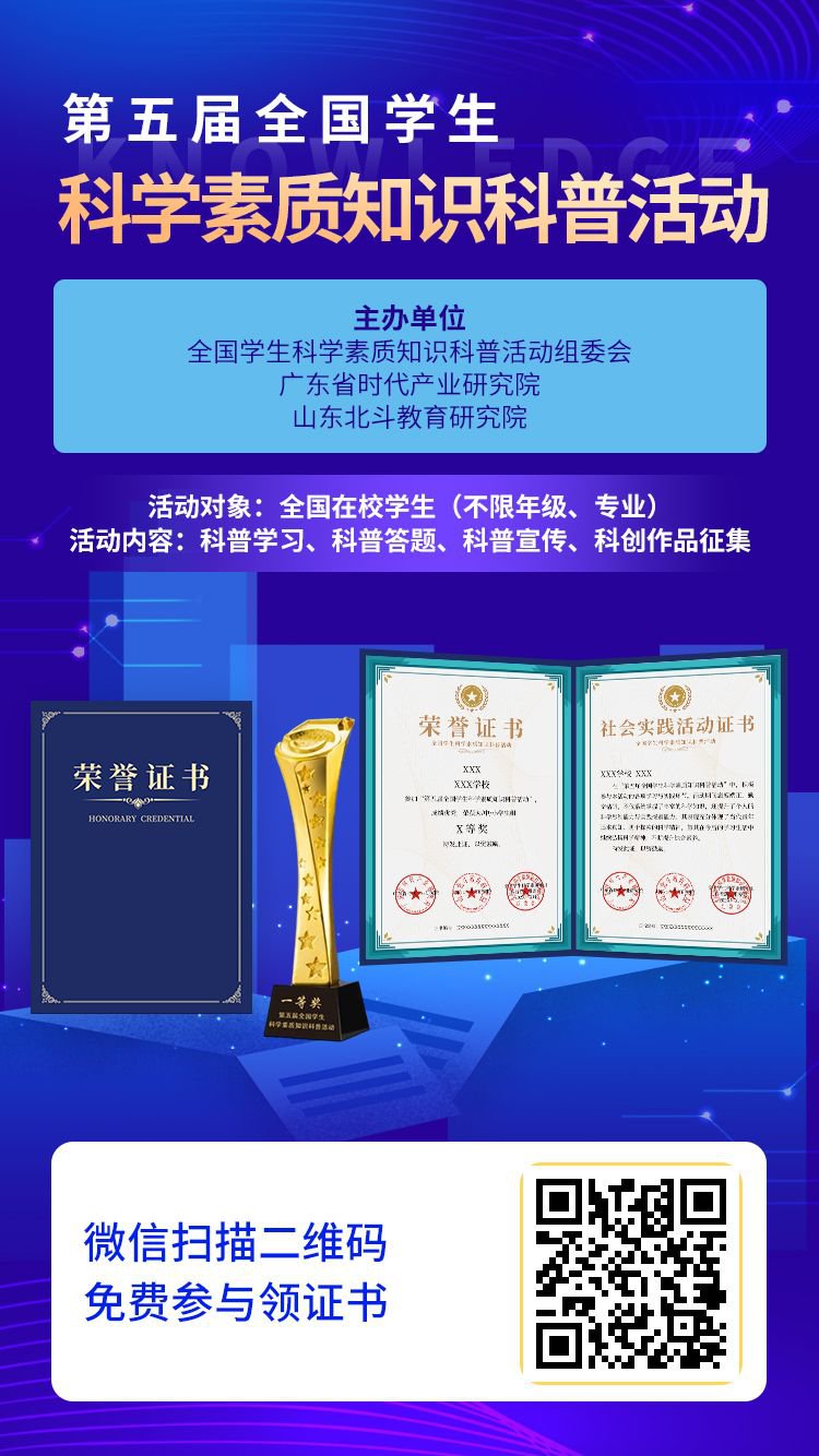 活动名称:第五届全国学生科学素质知识科普活动【免费答题,及格领证书】