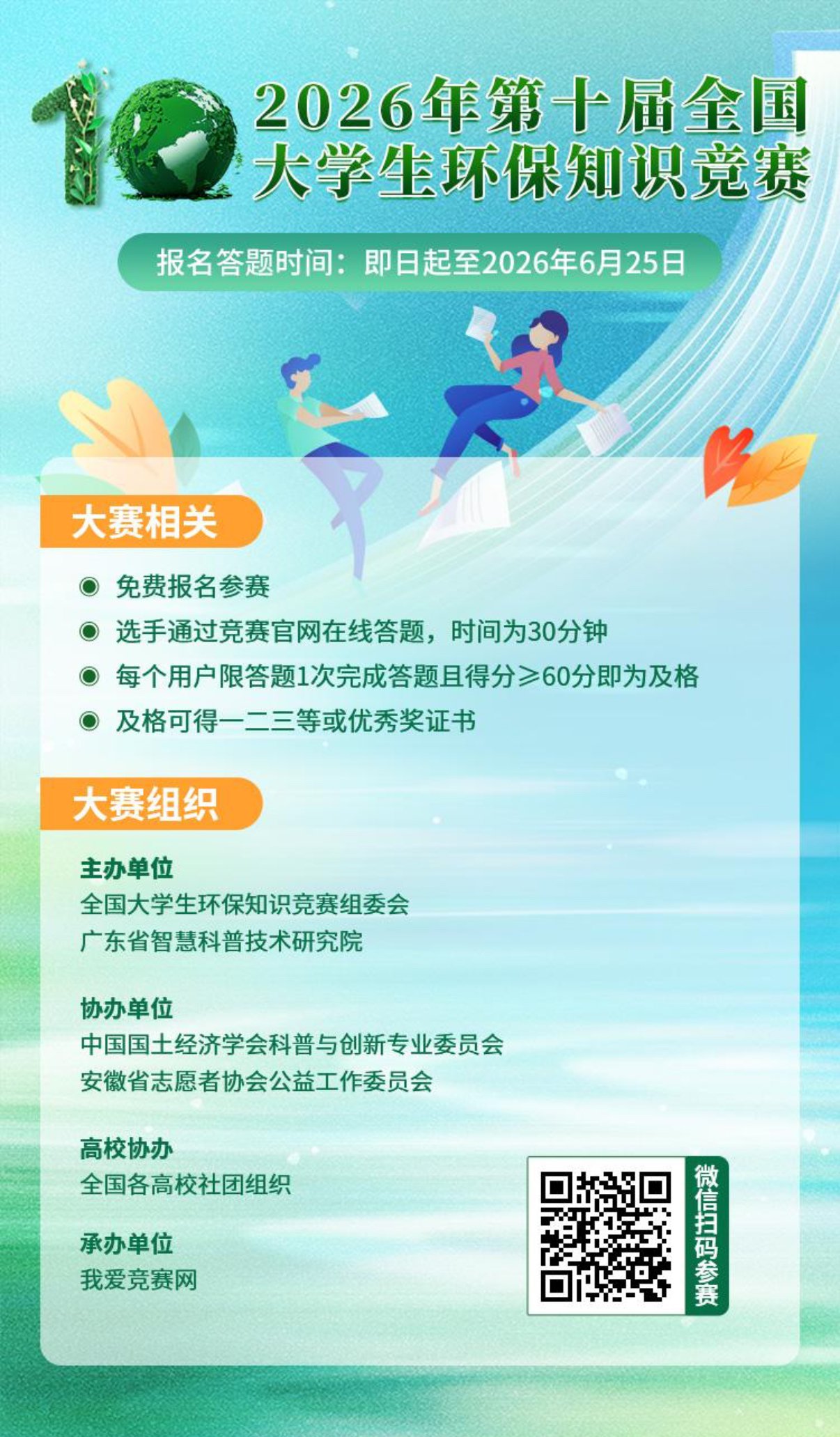 为贯彻落实习近平生态文明思想和党的二十届四中全会精神,牢固树立和践行绿水青山就是金山银山的理念,站在人与自然和谐共生的高度谋划发展,提升大学生生态文明意识,展现当代青年环保担当与青春风采,激发更多人参与到环保事业中来,壮大中国生态文明建设力量。在第57个“世界地球日”和第55个“世界环境日”来临之际,特决定继续举办2026年第十届全国大学生环保知识竞赛活动。诚邀各高校团委社团协办,通过校园线上线下平台宣传竞赛活动,组织本校师生参与,践行生态文明理念。全国大学生环保知识竞赛已成功举办九届,累计近千万名大学生参加线上答题,一千多所高校团委社团协办,引起了公众对环保事业的大力关注,有力推动了生态文明理念的普及和深化。本届竞赛将继续践行绿色发展理念,营造浓厚的环境保护文化氛围,在党中央领导下为提高大学生的环保意识,保护美化生态环境以及为各高校创办绿色学校和各城市创办绿色城市做出应有的贡献。