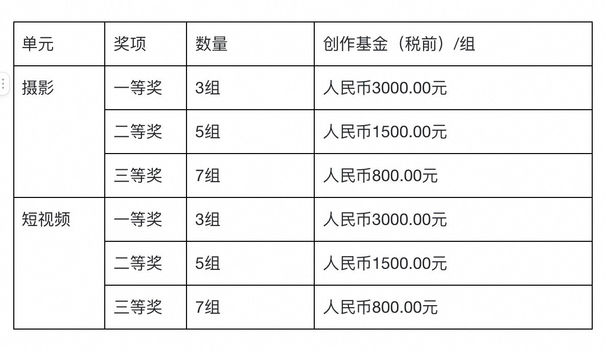 共设获奖作品30件,其中摄影单元与短视频单元各15件,同一作者不重复入选。主办方将给予获奖作者创作基金资助,支持大学生开展摄影创作。入选作者还将获得由阿里云提供的价值1000元的纪念品礼包和AI研学名额。
