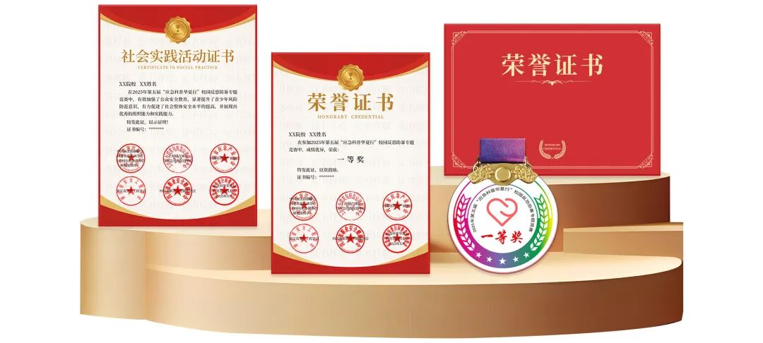 参加竞赛时,系统将随机从题库中抽取25道试题供参赛人员作答,其中含单选题15道、多选题5道、判断题5道,每道题分值4分。参赛者完成答题且得分大于等于60分即合格,答题合格者,可根据答题结束后页面提示获得《2025年第五届“应急科普华夏行”校园反恐防暴专题竞赛》电子版荣誉证书,可作为评奖评优及社会实践活动的证明。