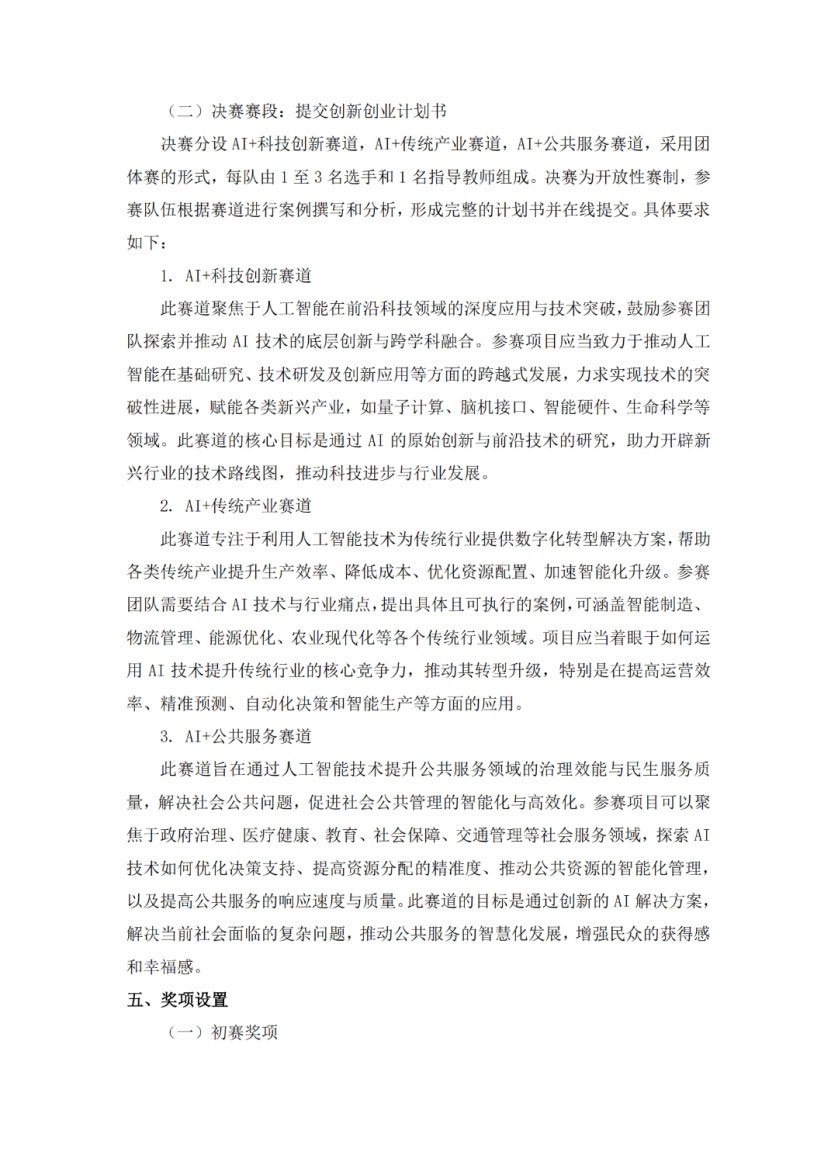 决赛分设AI+科技创新赛道,AI+传统产业赛道,AI+公共服务赛道,采用团体赛的形式,每队由1至3名选手和1名指导教师组成。决赛为开放性赛制,参赛队伍根据赛道进行案例撰写和分析,形成完整的计划书并在线提交。具体要求如下: