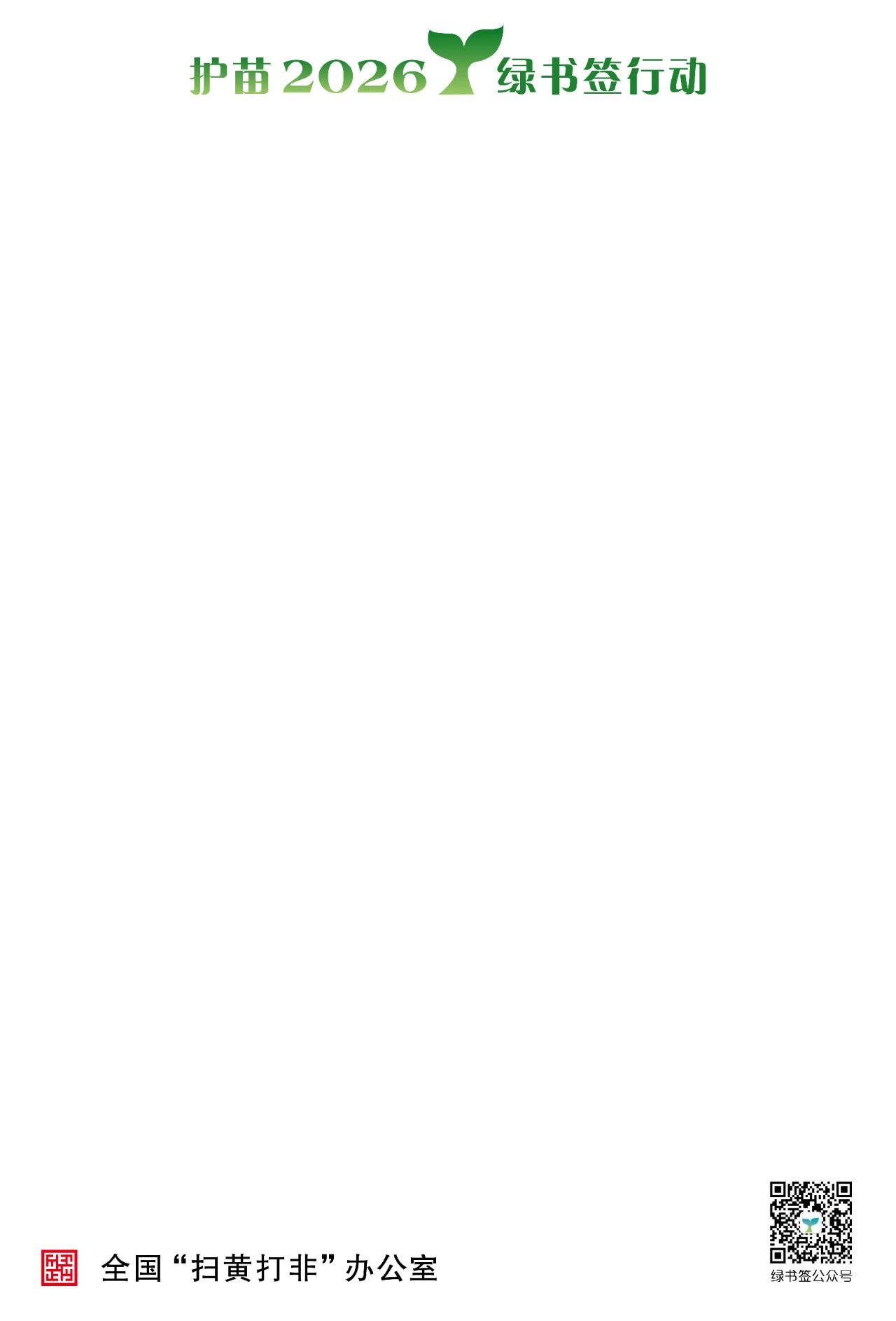为深入推进“护苗”专项行动,倡导“绿色阅读、文明上网”, 着力增强未成年人对非法出版物及有害信息的鉴别能力和防范意识,营造护助未成年人健康成长的浓厚氛围。即日起,面向全社会征集2026年“绿书签行动”海报,欢迎大家积极踊跃参与投稿。