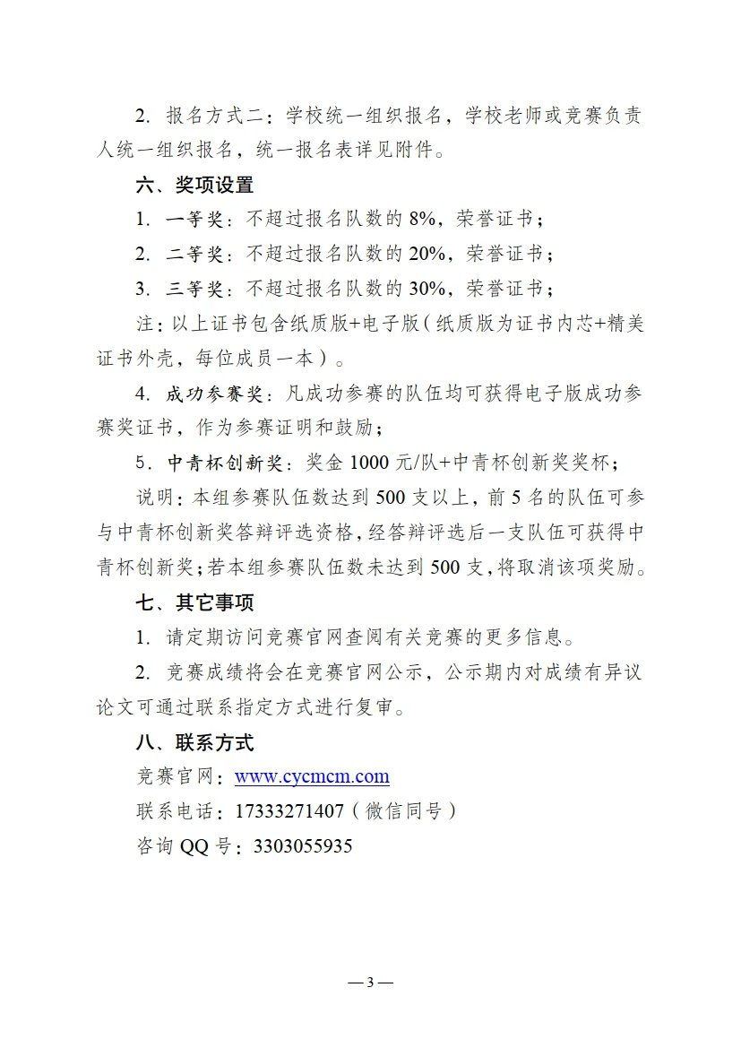 说明:本组参赛队伍数达到500支以上,前5名的队伍可参与中青杯创新奖答辩评选资格,经答辩评选后一支队伍可获得中青杯创新奖;若本组参赛队伍数未达到500支,将取消该项奖励。