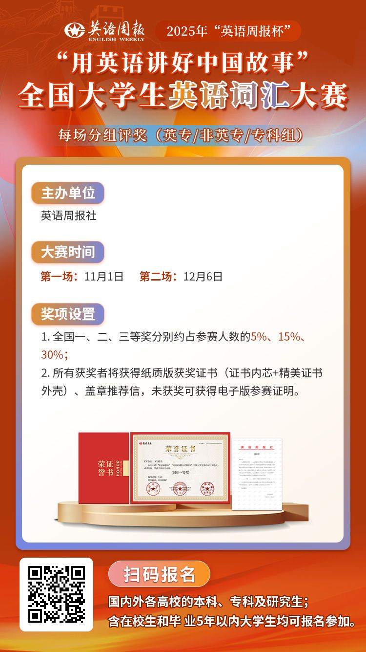 大赛名称:2025年“用英语讲好中国故事”全国大学生英语词汇大赛