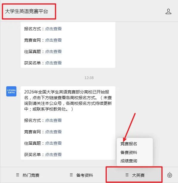 菜单栏点击“大英赛-竞赛报名”获取各高校报名方式,将第一时间更新!