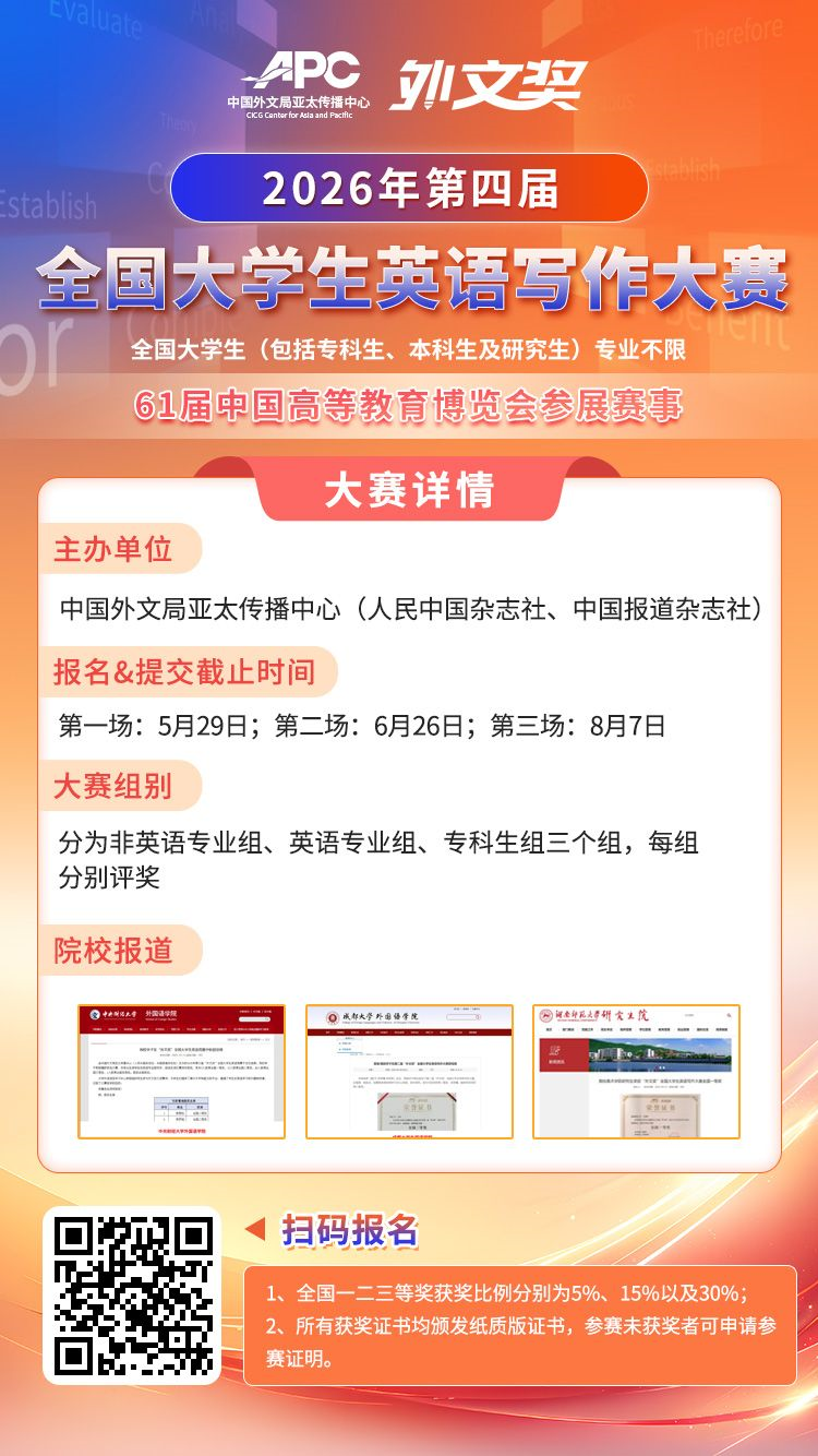为全面贯彻《中华人民共和国国民经济和社会发展第十四个五年规划和2035年远景目标纲要》,落实中央建设高质量教育体系的工作部署,不断强化我国外文交流队伍的建设。以提高青年学子外语综合能力为目标,整合外语学科资源,丰富外语学习方式,为国家战略发展需要提供强有力的人才保障。中国外文局亚太传播中心继续面向全国举办2026年第四届“外文奖”全国大学生英语写作大赛。