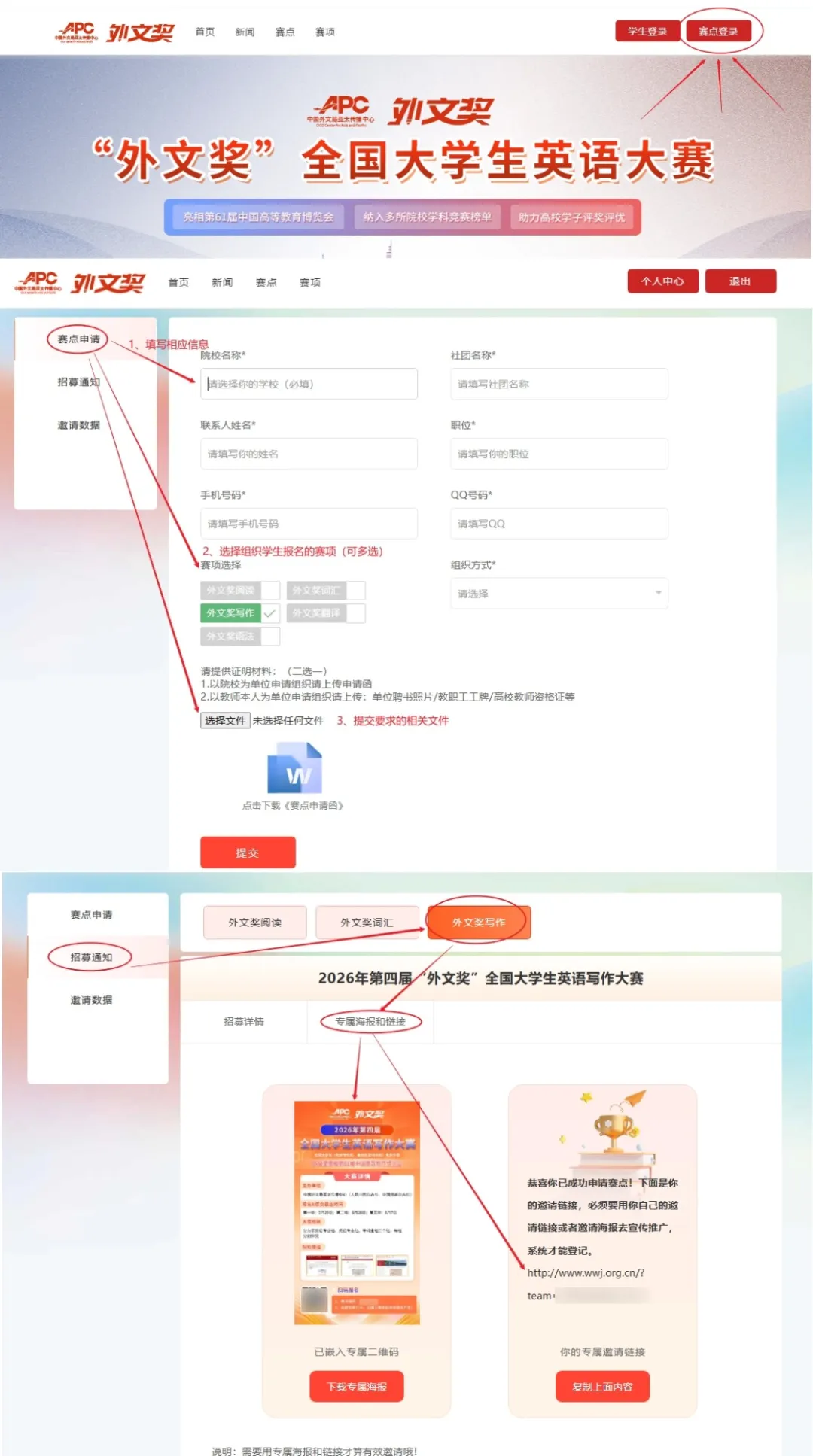 点击赛点登录按钮→注册相应信息→勾选申请赛项→选择以院校为单位申请组织→下载申请表盖章后上传→等待审核通过即可;