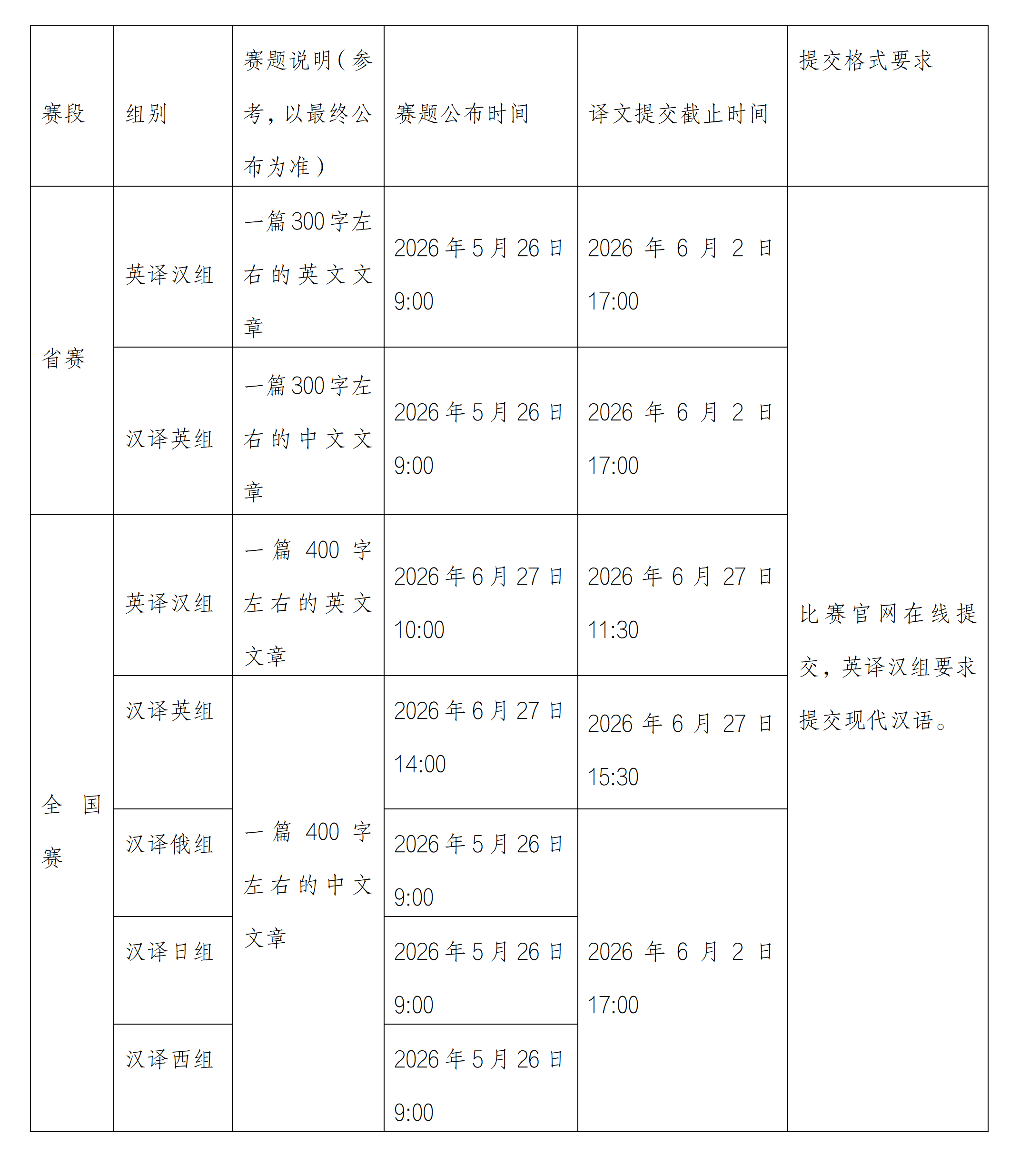 汉译俄组、汉译日组、汉译西组只设置全国赛,报名选手在2026年5月26日9:00-6月2日17:00登录官网查看全国赛阶段题目并提交译文作品。