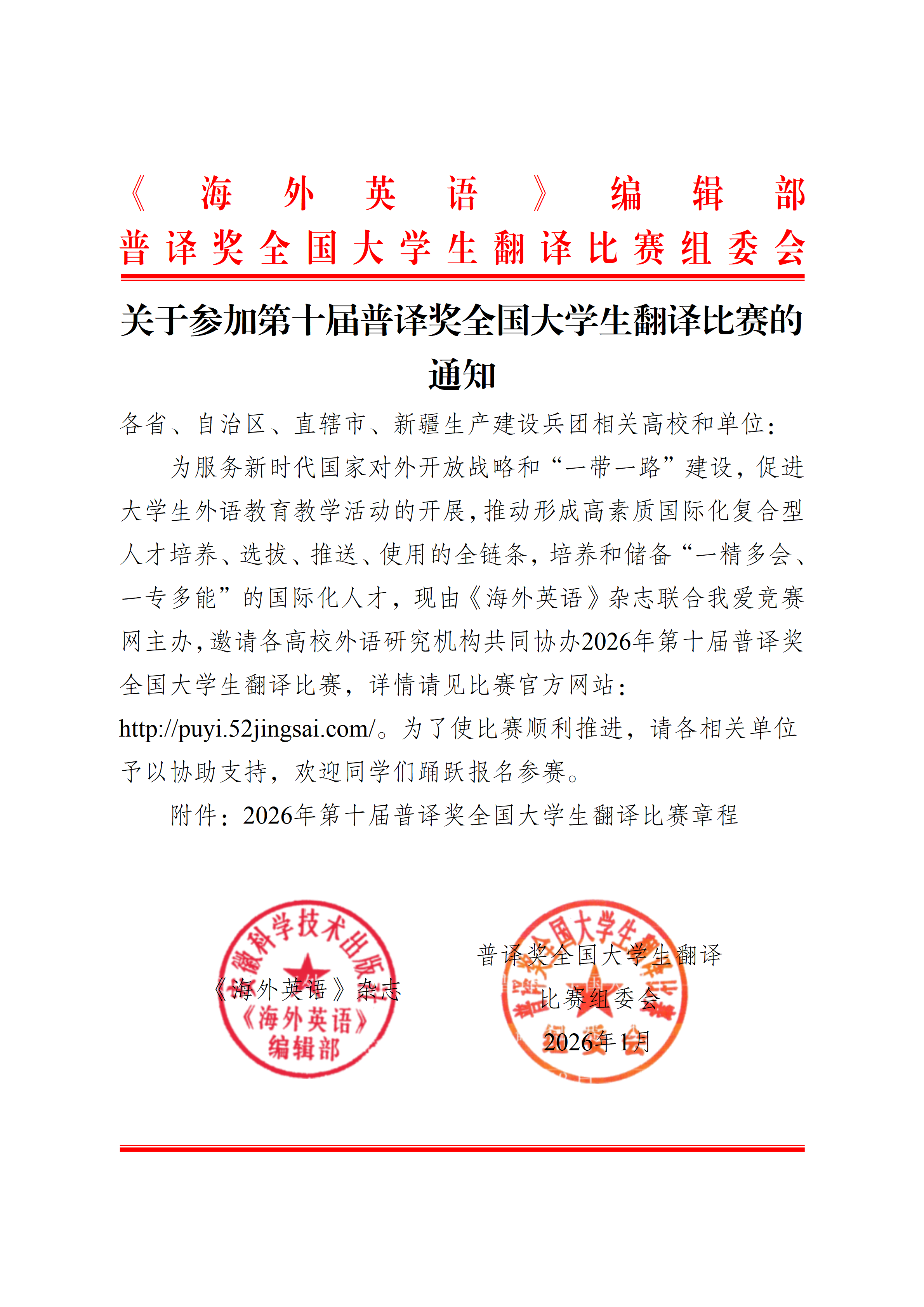 在新时代国家对外开放战略和“一带一路”建设的背景下,为促进大学生外语教育教学活动的开展,推动形成高素质国际化复合型人才培养、选拔、推送、使用的全链条,培养和储备“一精多会、一专多能”的国际化人才,“普译奖”系列赛已成功举办九届普译奖全国大学生翻译比赛。作为外语类品牌赛事,“普译奖”系列赛面向广大高校学生,受到了各高校及外语研习机构的广泛好评。2026年第十届普译奖全国大学生翻译比赛在此基础上由《海外英语》杂志联合我爱竞赛网主办,邀请各高校外语研究机构共同协办。