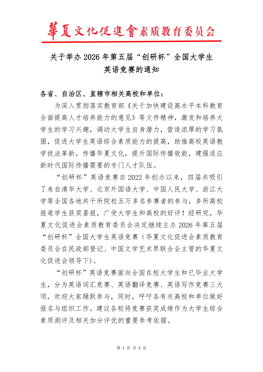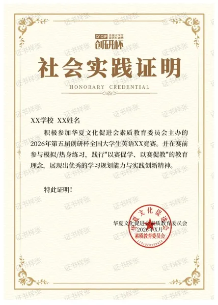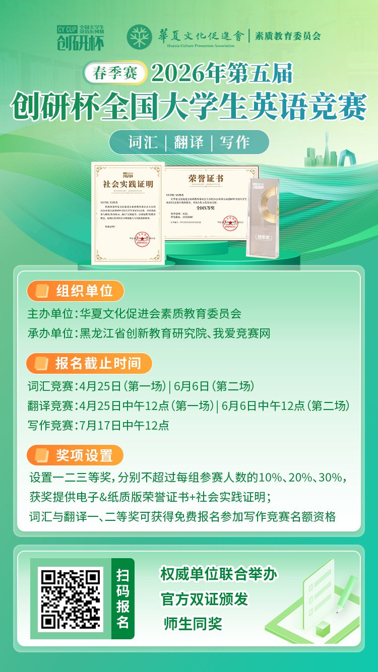 主办单位:华夏文化促进会素质教育委员会承办单位、黑龙江省创新教育研究院、我爱竞赛网组织单位、创研杯全国大学生英语竞赛组委会