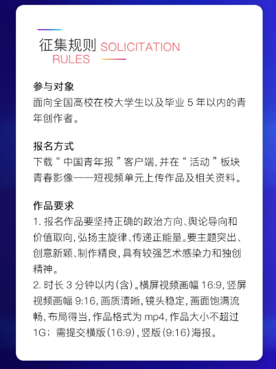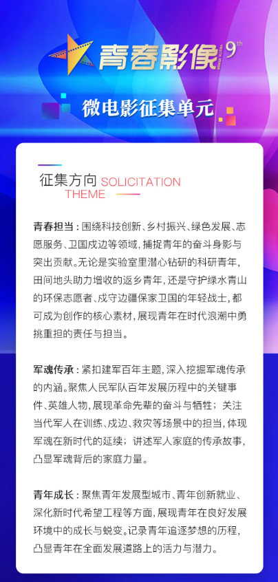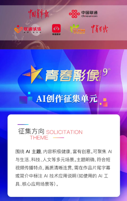 诚邀广大青年以青春为笔、以创意为墨,用影像定格热血瞬间,用歌声传递追梦力量,讲述青春故事,解锁高光时刻!