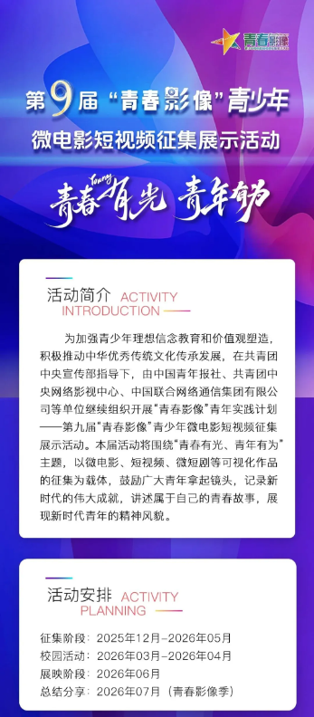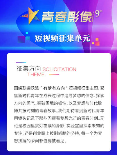 在共青团中央宣传部的指导下,由中国青年报社、共青团中央网络影视中心、中国联合网络通信集团有限公司主办,联通在线信息科技有限公司、联通沃悦读科技文化有限公司、北京中青盛世传媒文化有限公司、北京中青在线网络信息技术有限公司等单位共同承办的第九届“青春影像”青少年微电影短视频征集展示活动正式启动征集!